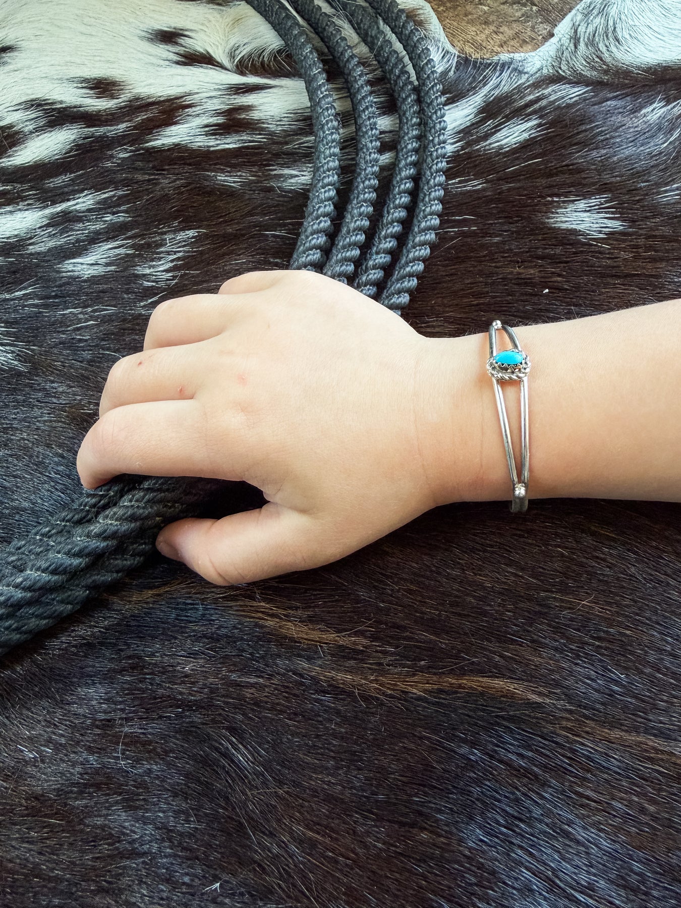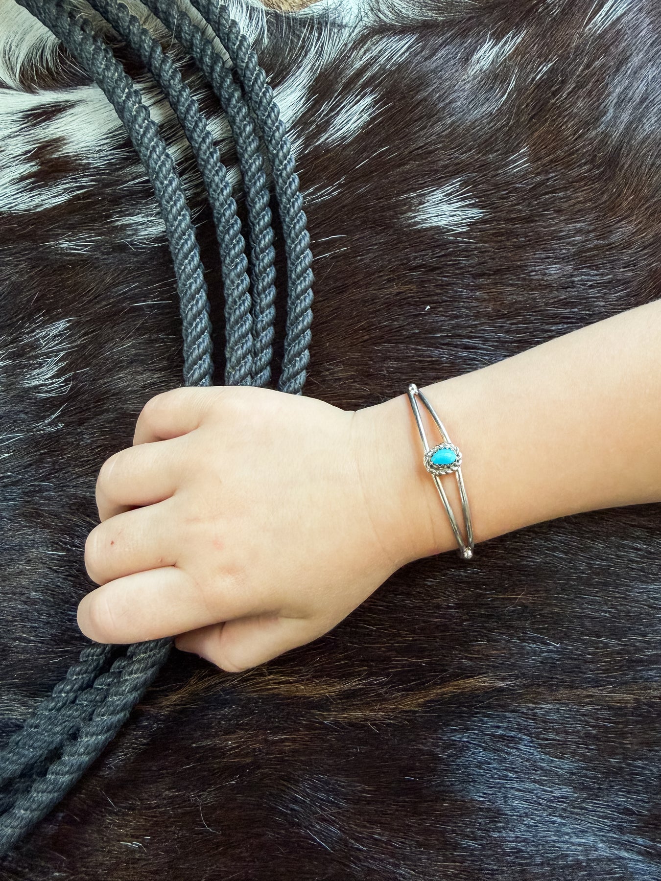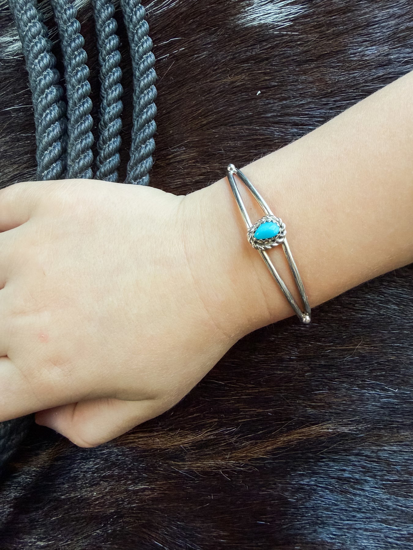 This bracelet is the perfect starter piece for your little gal. This 1 stone piece is a genuine Navajo design and made from sterling silver. Adjustable to grow with her.