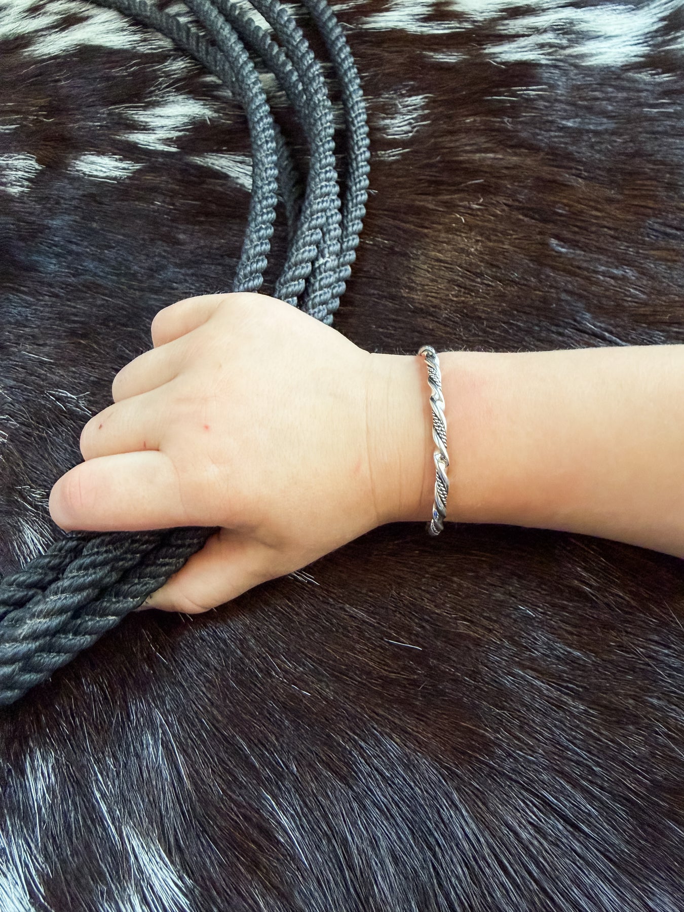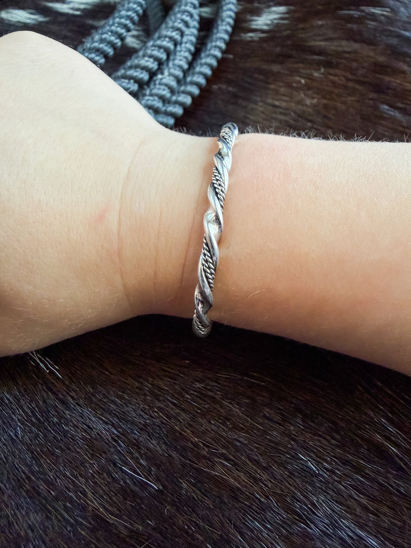 This baby bracelet is the perfect starter piece for your little gal.  This is twisted genuine Navajo design is made from sterling silver. Adjustable to grow with her.