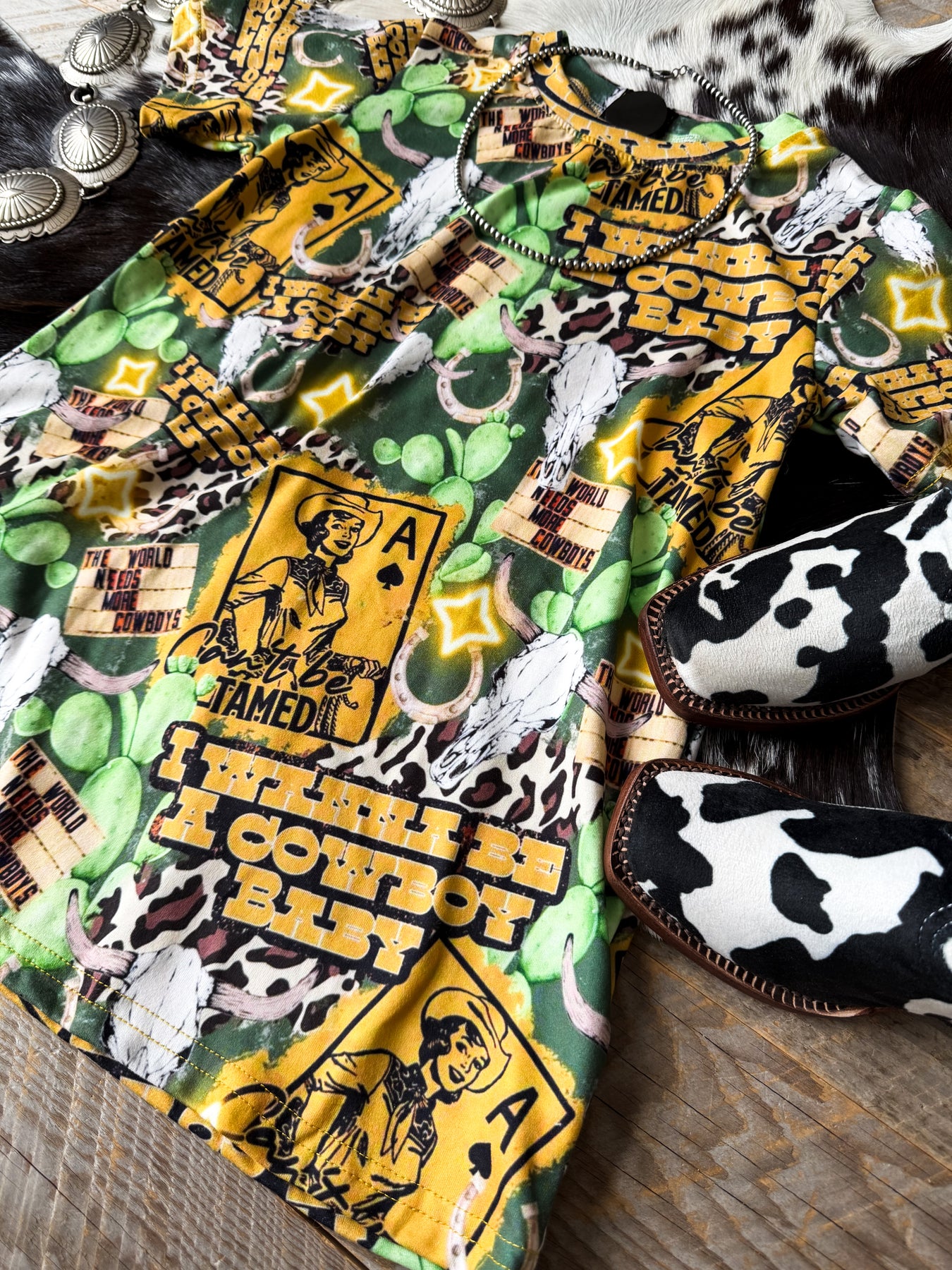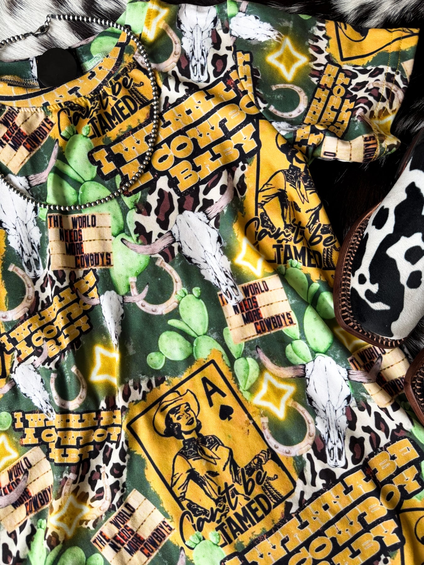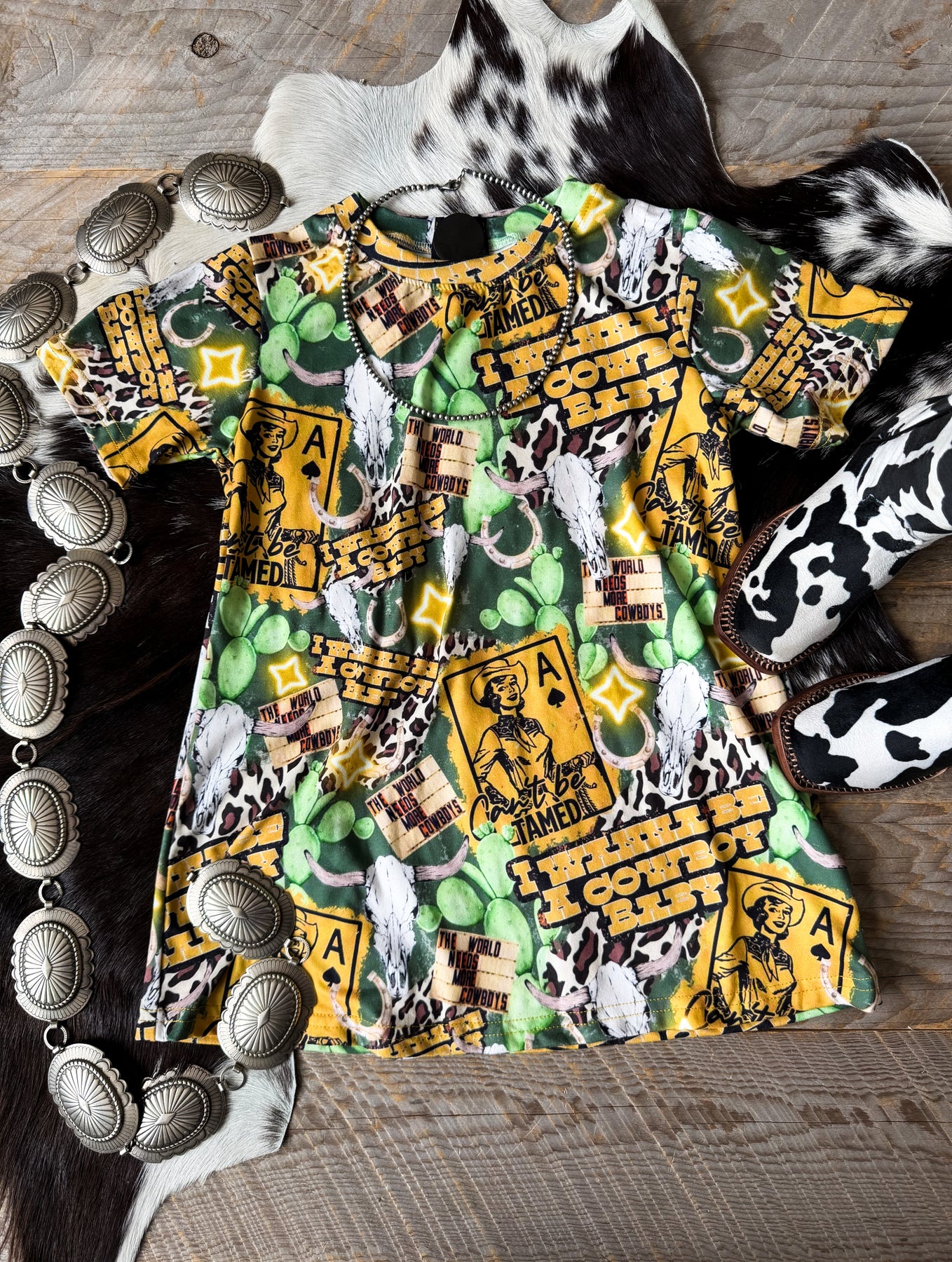 This T-shirt dress has the cutest western collage print. It is so soft that your little gal won't want to take it off.