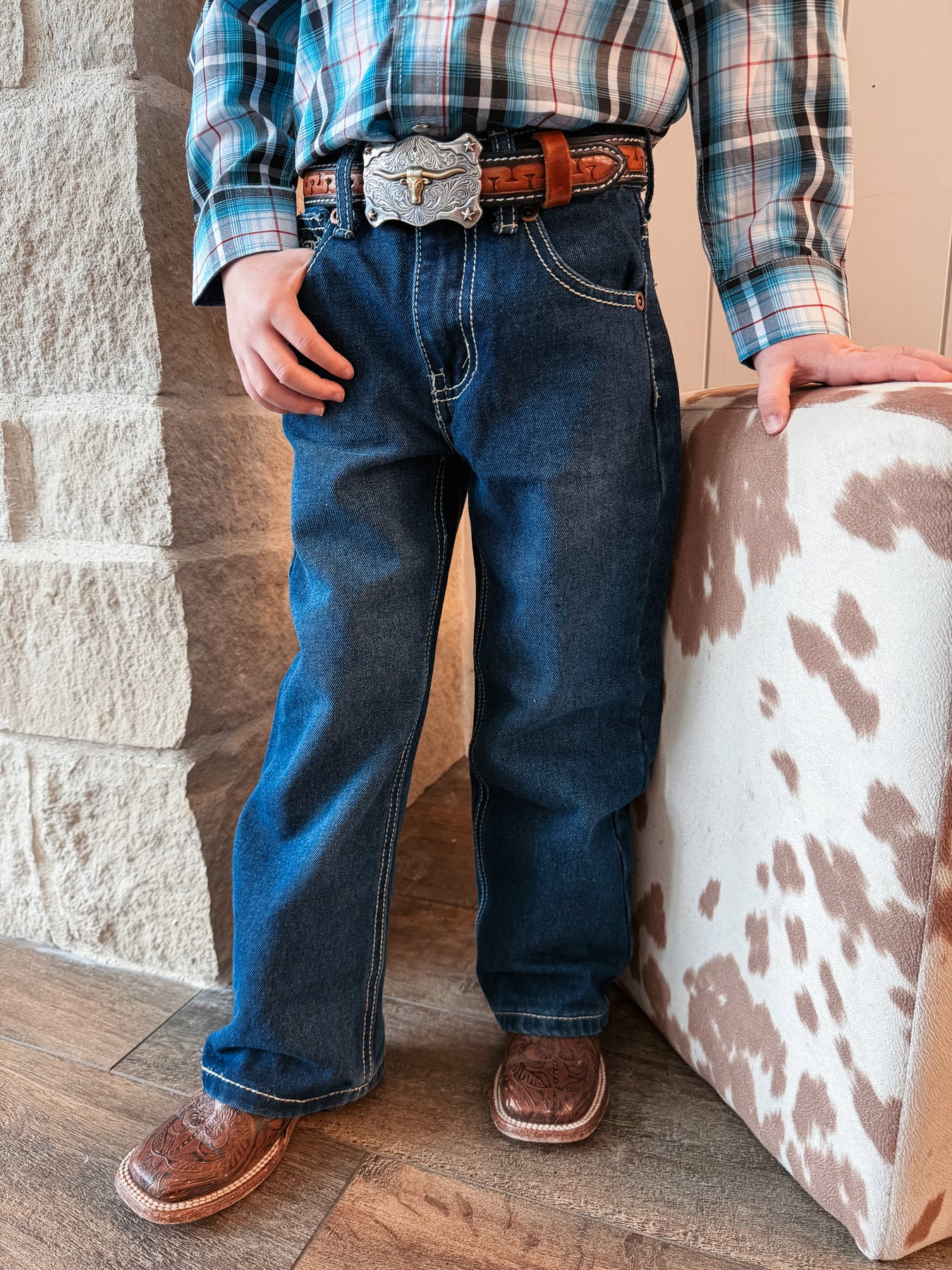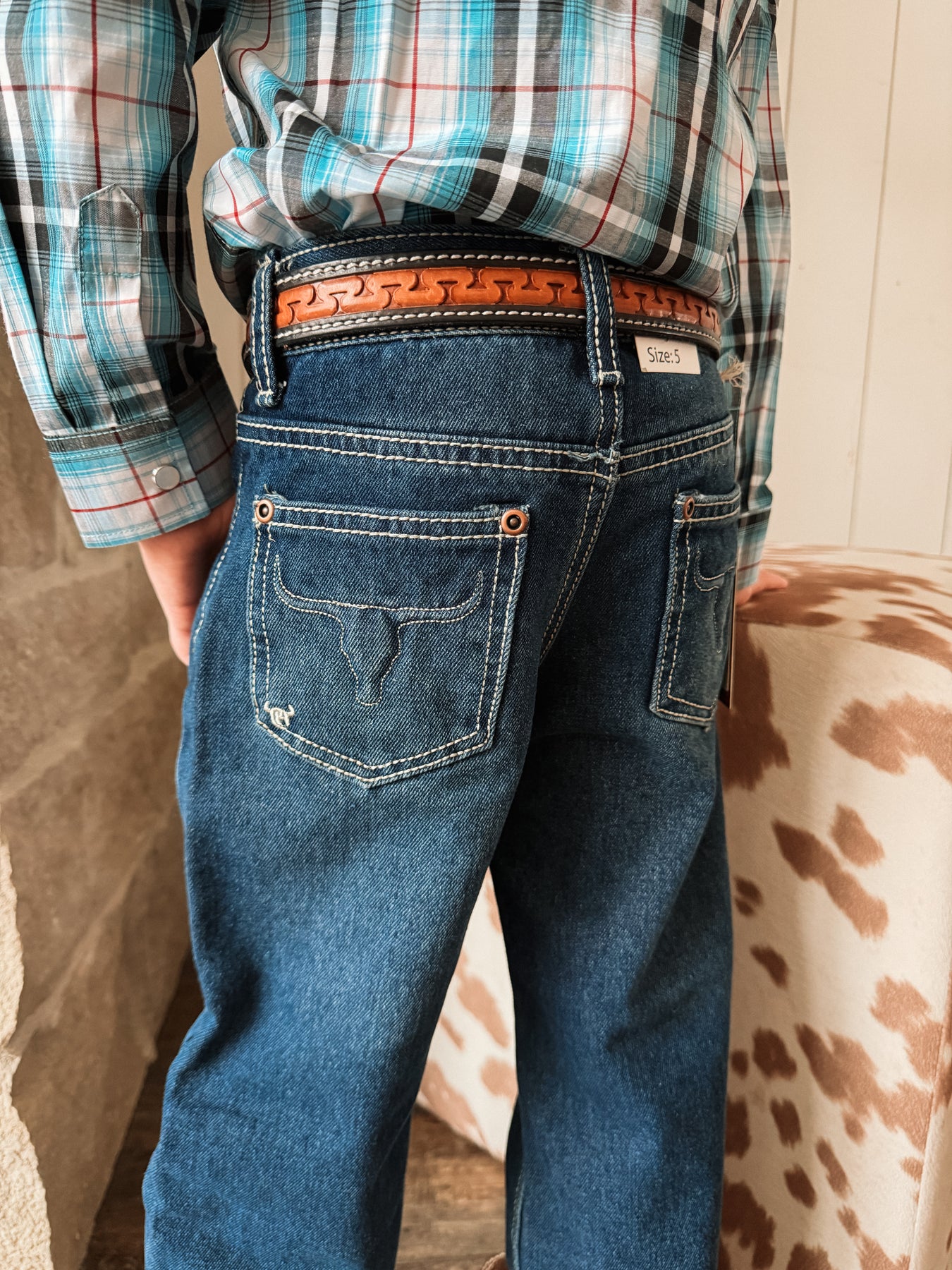 Denim that stands the test of cowkids! The invisible skull pocket outline and Cowboy Hardware brand guarantee he’ll look good and be ready for anything! Fits true to size and has an adjustable waistband.