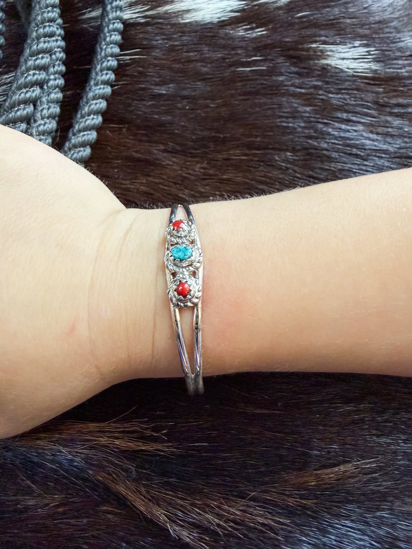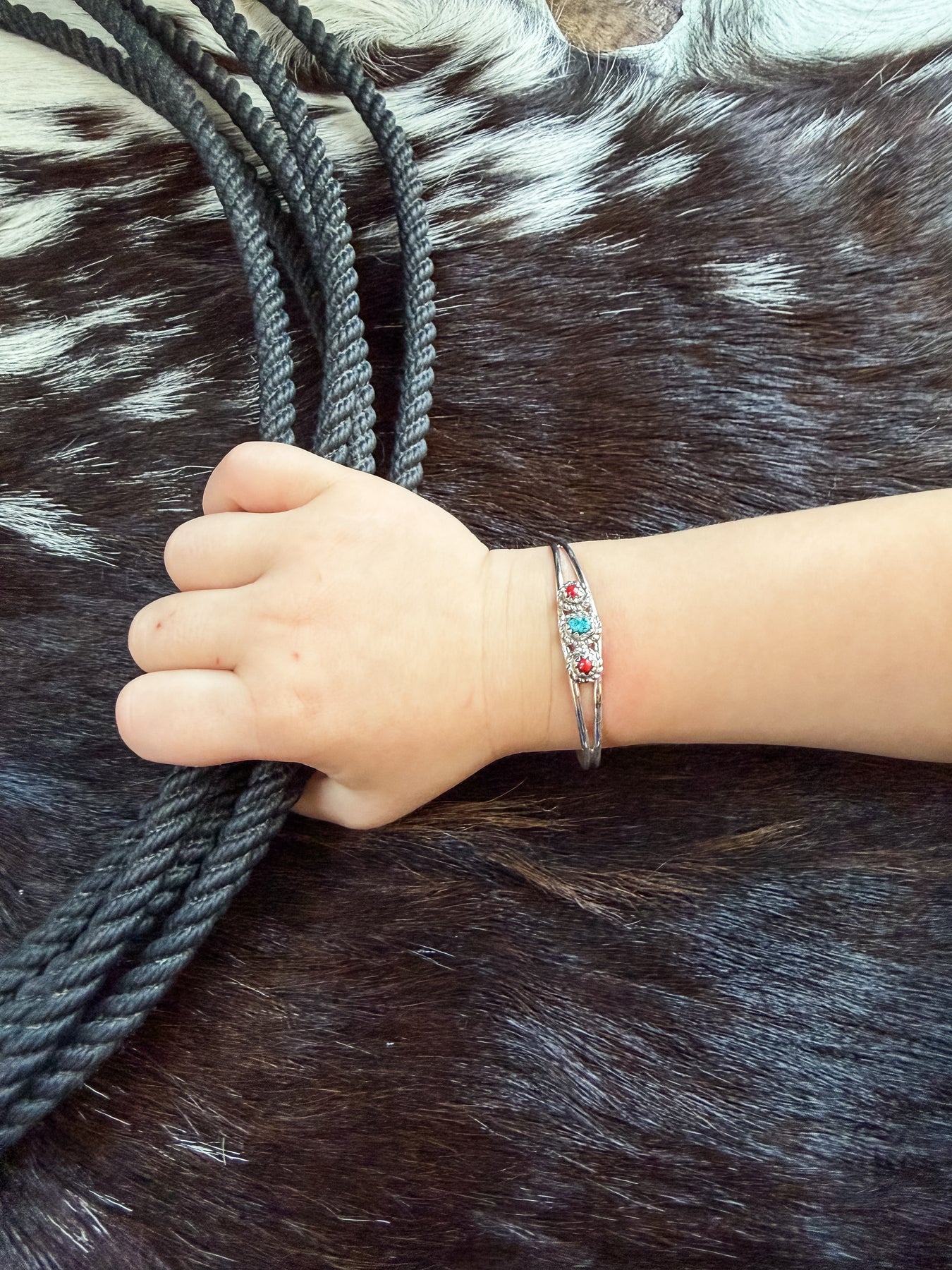 This baby bracelet is the perfect starter piece for your little gal. This 3 stone piece is a genuine Navajo design and made from sterling silver. Adjustable to grow with her.