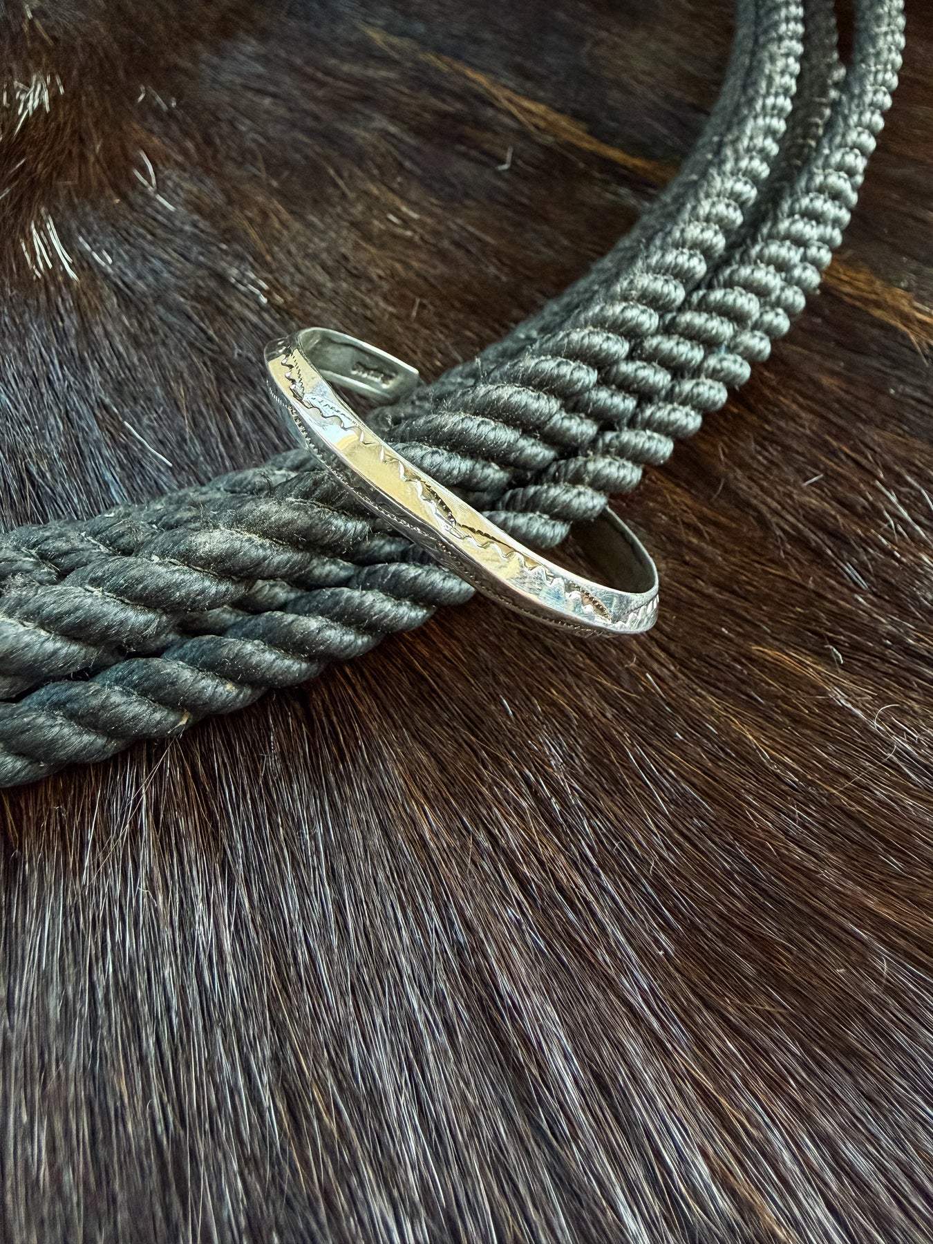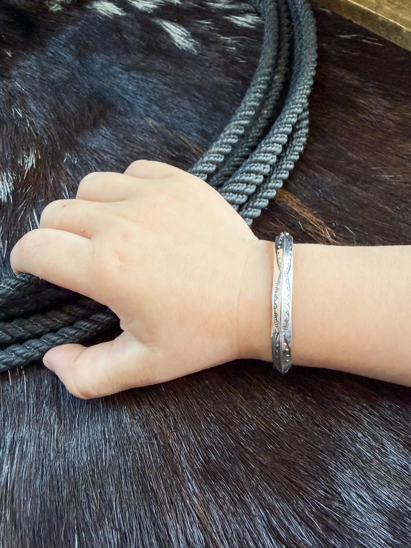 This baby bracelet is the perfect starter piece for your little gal. This is a hand stamped genuine Navajo design and made from sterling silver. Adjustable to grow with her.